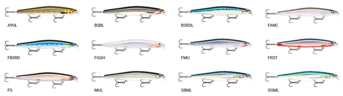 - Köderfarben / Farb-Dekors: AP/Albino Perch - AYU - GOC/Gold Copper - MRT/Metall Rainbow Trout - P/PERCH - SB/SILVER BLACK - SF/Silver Flake - WO/WHITE ORANGE